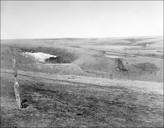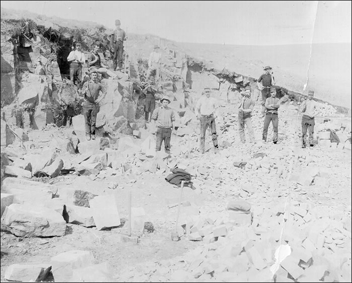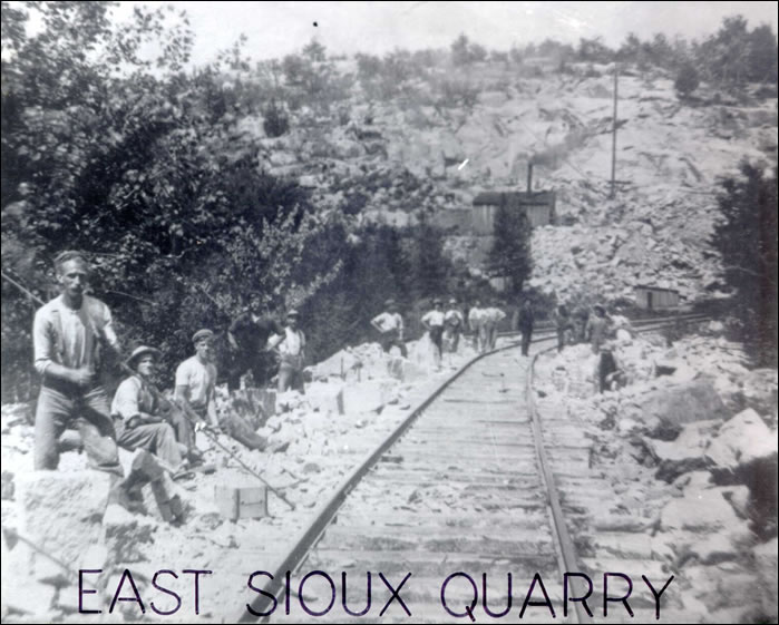By the 1880s, the quarry business in Sioux Falls had developed on a limited basis. Enticed by the abundance of quartzite along the bluffs of the Big Sioux River, partners C. W. Hubbard and James E. Riley expanded their quarry operation into Split Rock Township six miles east of downtown. This occurred in 1887 with the building of the town of Ives, the predecessor to East Sioux Falls. As the photo shows, the rock was just below the surface so it could be removed with relative ease. The following year the two men formed the Sioux Falls Granite Company.