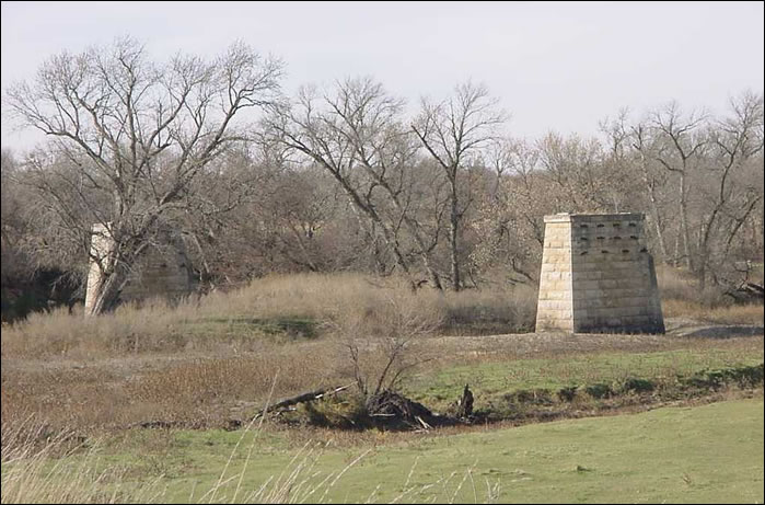 In September of 1887, construction began on the railroad bridge across the Big Sioux River just east of Ives. By early December the rail reached Ives and the project was completed to Sioux Falls by year end. It had taken six months to extend the rail line from Cherokee, Iowa. Nearly a century later the Illinois Central would abandon the line, remove the rail and sell the right-of-way. The present day photo shows the piers that once supported the river bridge.